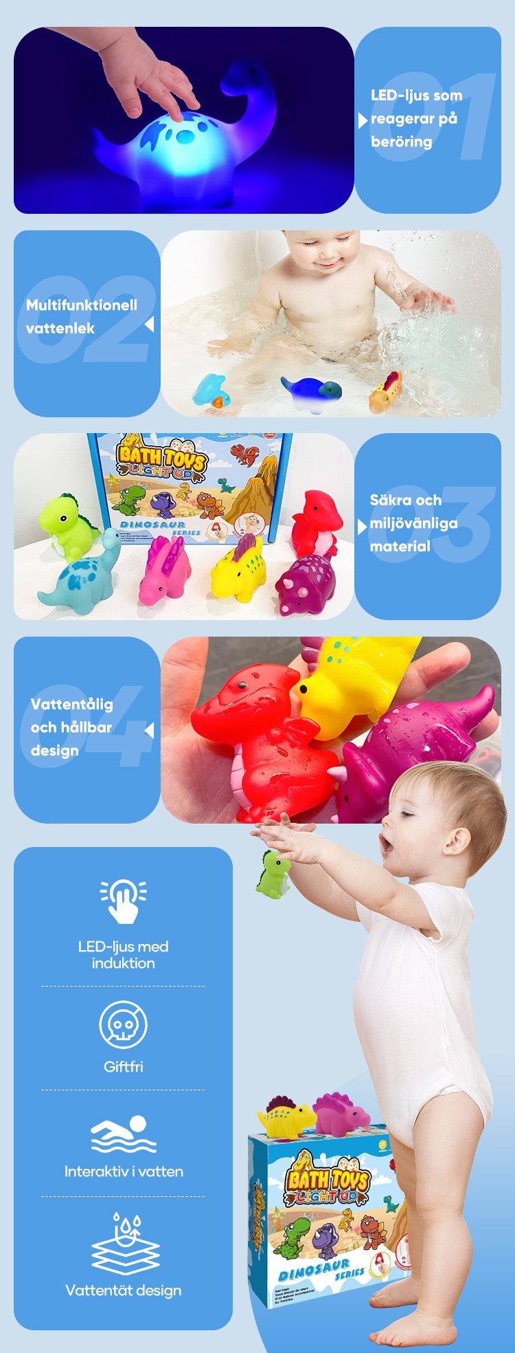 De är säkra, roliga och lärorika – badstunden blir både spännande och fylld av inlärning. Barnen tycker det är jättekul att röra vid dem och se lamporna tändas!