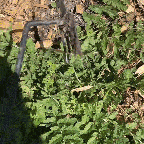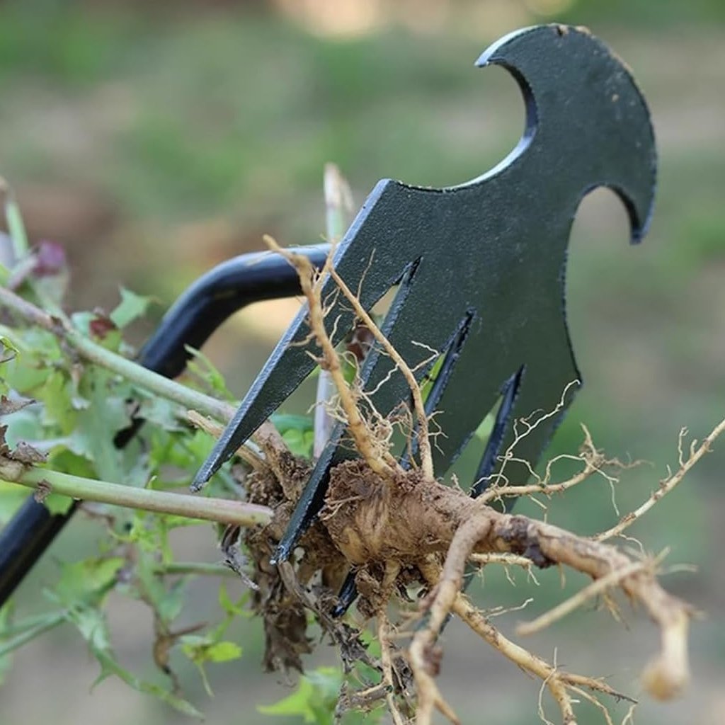 ✅ Den vinklade 4-tandsdesignen skapar en fokuserad tryckzon runt ogräset och greppar hela rot systemet säkert.