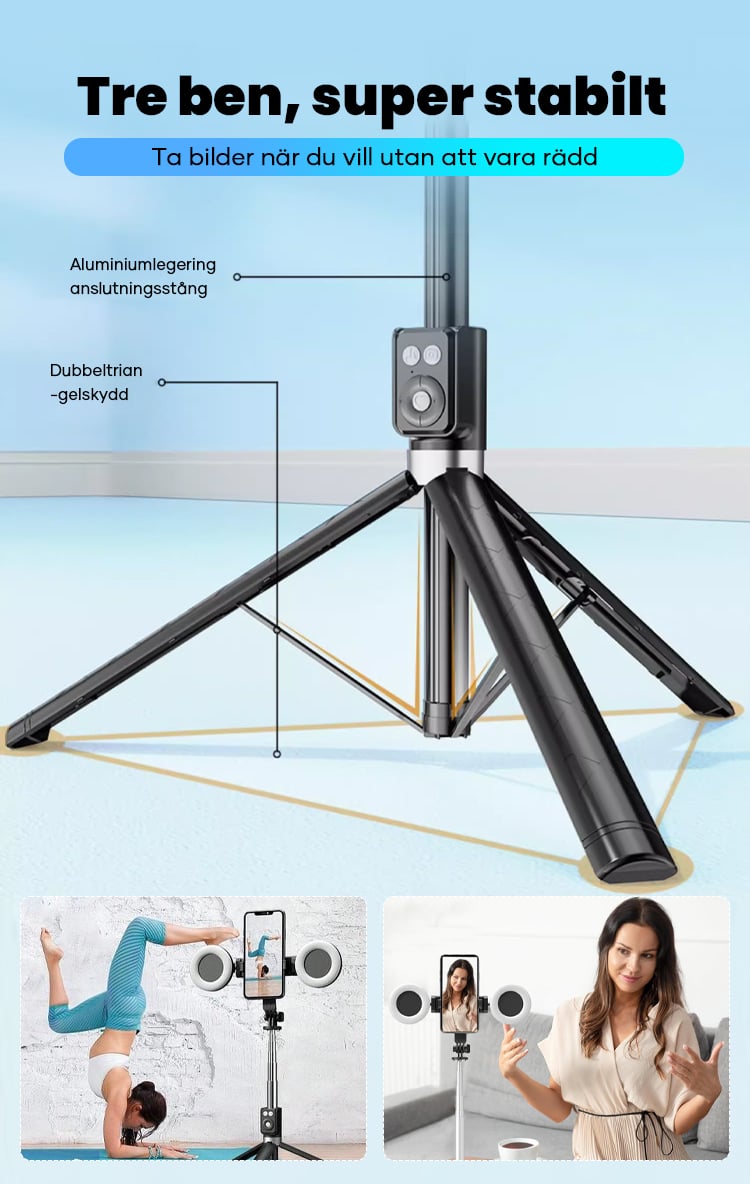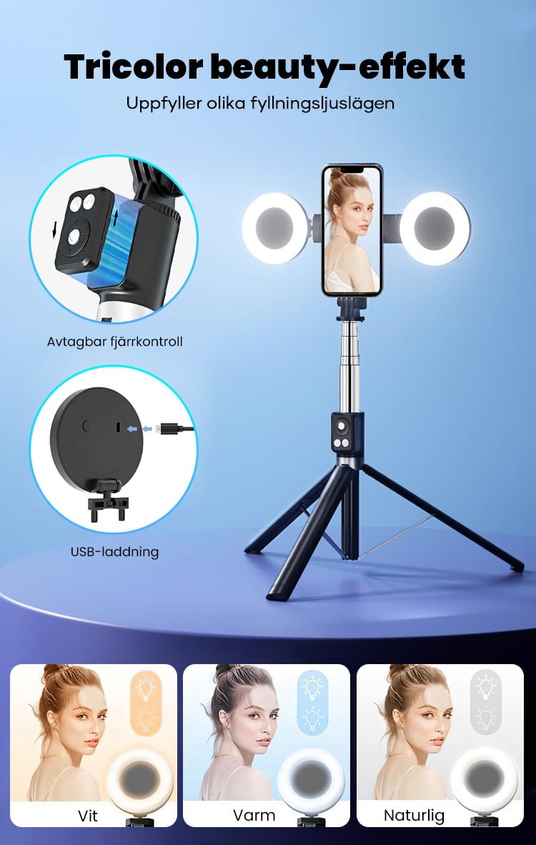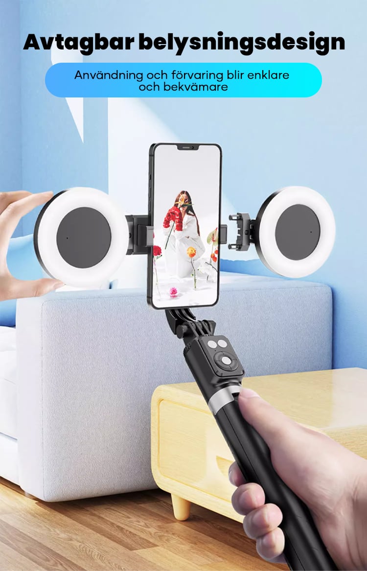 Den här selfie-stickan är fantastisk! Den är superlätt att använda, och fyllningsljuset är en riktig game-changer för mina bilder. De olika ljuseffekterna passar perfekt för alla situationer.